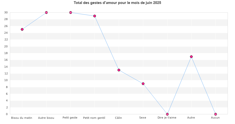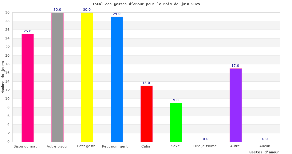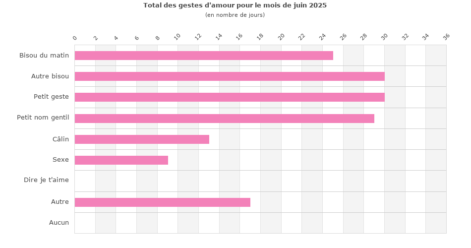 | Nombre de jours où je n'ai eu droit à aucun geste d'amour en juin 2025 (soit sur 30 jours) : | 0 |